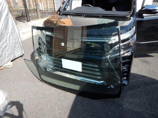 フロントガラス交換をする時は、車の前方に新品のガラスを置いて準備をします。新品のガラスは取り付ける前にキズやカケがないかチェックをして、ガラスを綺麗に拭き上げます。取り付けに必要な小さな部品の装着もここでします。