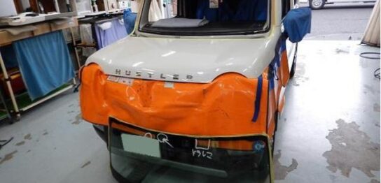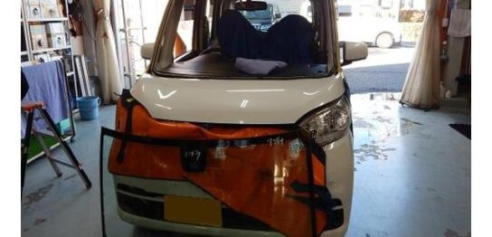 作業中の様子です。新品のフロントガラスは車の前方に置いた台の上に用意します。 フ