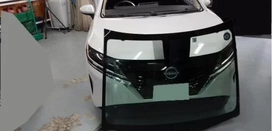 純正フロントガラスをご用意しました。新品のフロントガラスは車の前方の台に置いて装